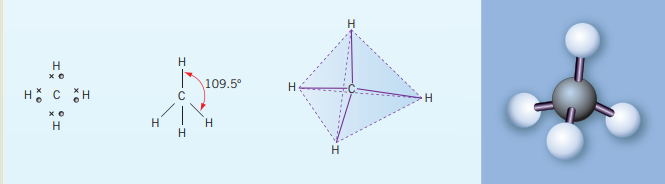 An example of such a bond is methane, . As carbon is in group IV, it has 4 valance electrons; four bonding electrons. In order to minimize repulsion each bonded hydrogen is as far away from each other in a 3D space. This entails the bond angle for H-C-H bond to be