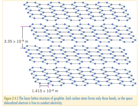 The delocalized electron is free to move around, and is the reason why graphite is conductive (and explains why diamond is not.) With only the weak Van der Waals forces keeping the layers of carbon together, it is easy for layers to slide on top of each other. Because the bonding within the layers is strong, it similarly has a high melting point of .
