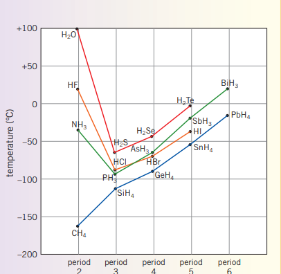 For instance, water exhibits hydrogen bonding and has a relatively high melting and boiling point when compared to other covalent molecules. Additionally, water has a low density when froze, and high surface tension (think belly flop) can be explained through hydrogen bonding.