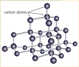 Diamonds are hard, non-conductive, clear solids that are used to cut hard materials (including other diamonds), and as jewelry (very unpleasant history + not relevant) The structure of a diamond is a result of carbon bonding with other carbon atoms in a tetrahedral fashion. All four of a given carbon’s valance electrons are used to bond with other carbon atoms. This is a contributing reason why diamond is non-conductive (electricity). Because the bonding forces within diamonds are strong, it is a hard substance (having a Moh of 10) and the energy required to break these bonds and turn diamond into a gas (sublime the substance), diamond must be at .