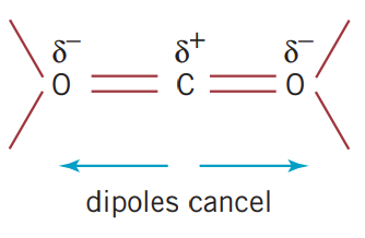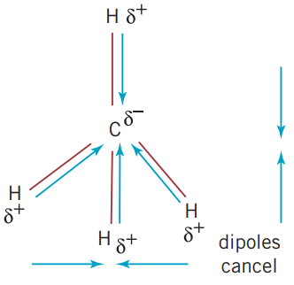 However, just because a molecule has polar bonds, it is possible for all the dipoles to cancel each other out. An example of this is in methane, . As all of the bonds all have the same difference in electronegativity. When determining whether a molecule is polar, the shape of the molecule must be considered. Due to methane’s tetrahedral molecular structure, all of the dipoles cancel each other out.