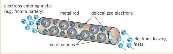 Because the sea of delocalized electrons exist throughout the metal in a fluid like state and exist within a discrete ratio with the cations, they experience a specific amount of electron electron repulsion. Thus when electrons are entering forms a battery for instance, electrons will also leave to keep this ratio in tact. This phenomenon is why metals are conductive.