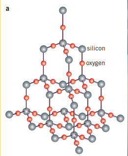 Silicon dioxide, or silica, is a major part of sand, and is used to make glass. It is a network covalent structure made up of 1 for every 2 . Silica is found in sandstone, silica sand, and quartzite. In its crystal form, it is known as quartz.