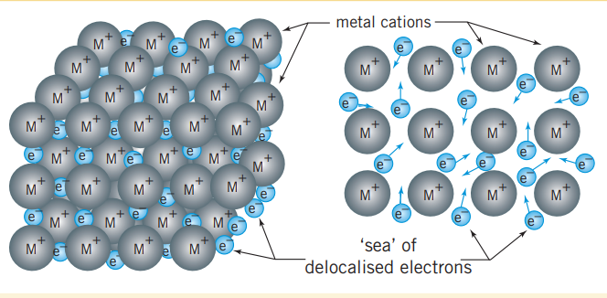 Metal ions are formed when atoms lose their valance electrons, and are arranged in a three-dimensional lattice. This array of ions is surrounded by freely moving electrons, that form a ‘sea’ of valance electrons that are said to be delocalized. This is because they are not confined to a particular location (as ions would be in ionic compounds) and can move throughout the structure. Electrons are attracted to the metal cations and this electrostatic attraction holds the lattice together. This kind of bonding is metallic bonding.
