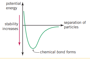However as two or more atoms approach each other, they begin to repel, this is also true for their valance electrons. These repulsive forces also increase the chemical potential energy within the system. At a certain point, when oppositely charged ions are attracted to one another, the potential decreases. The ideal distance where the valance electrons are attracted to the nuclei but have the minimum repulsion by other electrons and the nuclei are have a similar relationship with other nuclei, is where the chemical potential is lowest and where the chemical bond forms.