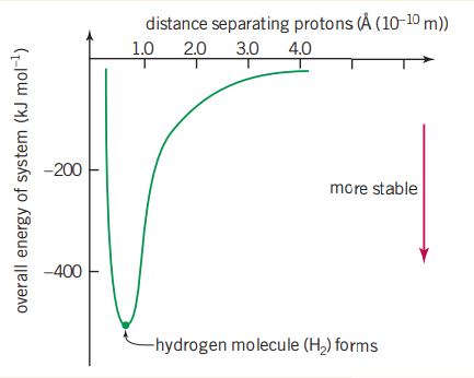 As two atoms approach each other, electrostatic attractions and repulsions occur between the nuclei and the electrons. Where the greatest energy has been lost to the environment is where the bond forms. For hydrogen this happens at as where the lowest energy is, is where the atom is the most stable.
