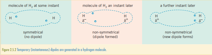 Considering the orientation of electrons, both bonding and non-bonding, it is possible for several electrons to be in a region. This results in an instantaneous dipole, which causes one region of a molecule to be more negative than another. Once an instantaneous dipole has been generated, it will influence the electrons on other molecules close to it, cascading across the substance. A moment later the molecule will have a different orientation but averaging out to have no permanent dipole. The billions of temporary dipoles will have resulted in a weak overall attractive, van der Waals’ force or LDF. They exist in all molecules.