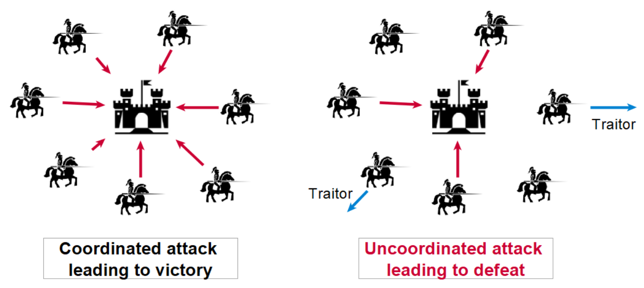 Defection from a common goal (for whatever reason) makes the end goal significantly harder to achieve for two reasons: People are significantly more likely to defect with the traitors once one has the resolve to do so; and there is less pressure on whomever is being sieged. This idea was developed by Marshall Pease, Robert Shostak and Leslie Lamport in 1982: describes the general difficulty of coordinating the actions of several independent parties in a distributed system.