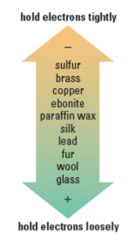 When materials are rubbed together, electrons can transfer from the material that holds it electrons loosely to a material that holds onto the electrons tightly -charge is conserved. Ex. charging ebonite using fur, the negative charge gained (negative lost) by the fur. Additionally, it produces oppositely charged objects.