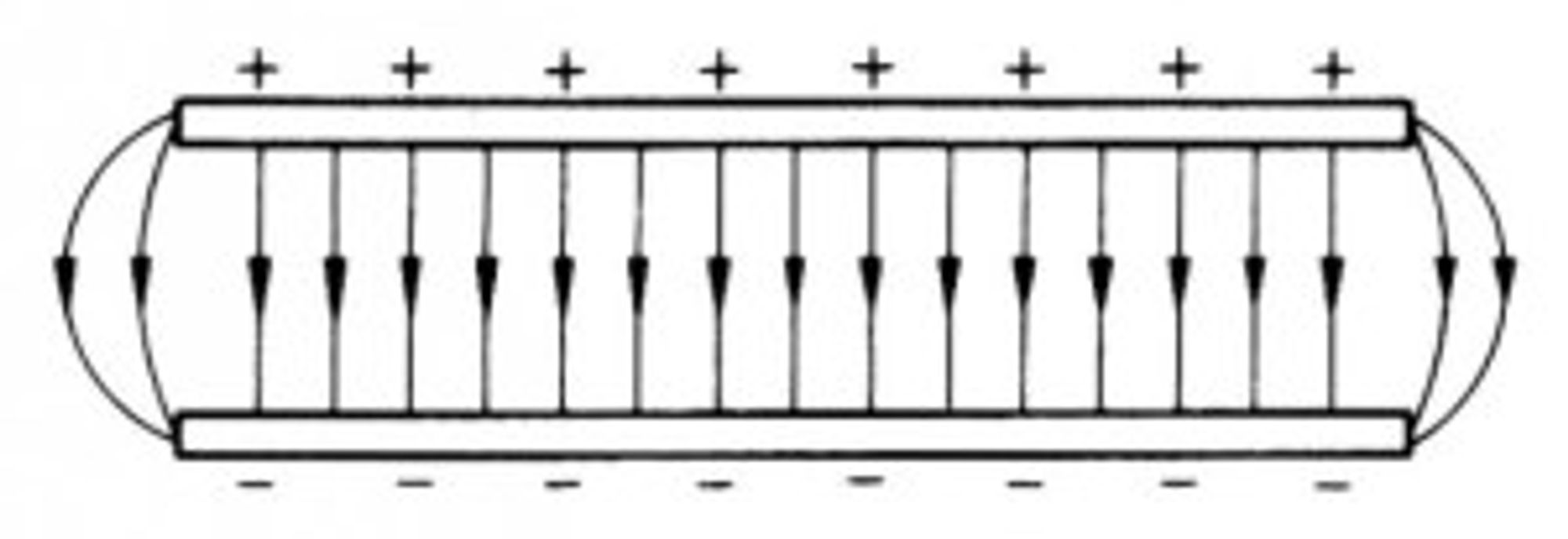 The electric field lines curve outwards near the edge of the plates. This is known as the “edge effect”. Electric field strength (E) is the force per unit charge experienced by a positive test change placed in a field.