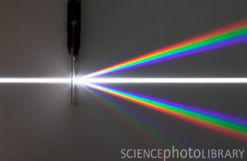 When white light is passed through a prism, we see a rainbow of visible light. The incident light is dispersed by refraction, changing the angle at which each component wavelength exists the prism.