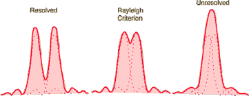 The Rayleigh criterion is when two points are just resolved. This is when the central maximum of one image coincides with the first minimum of the other.