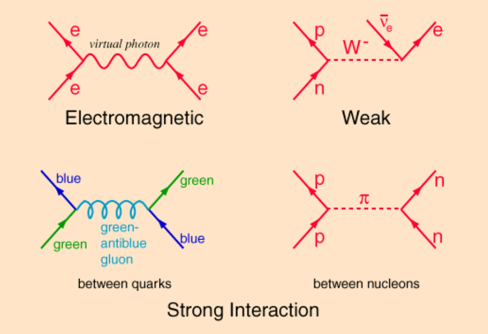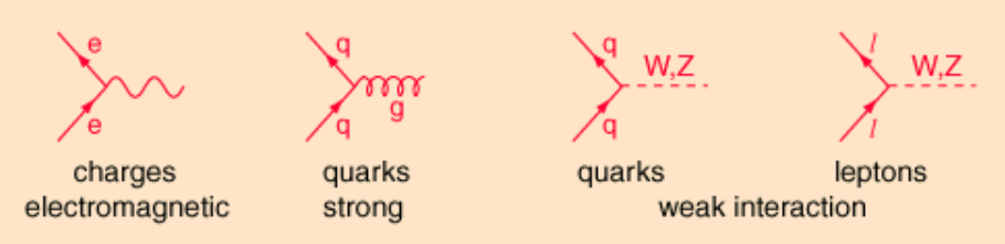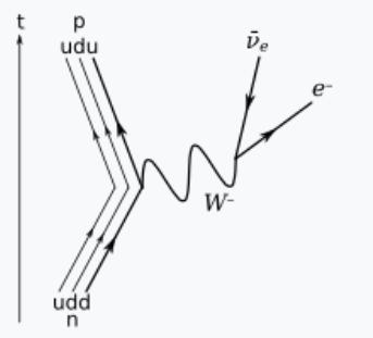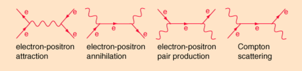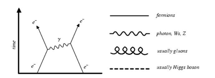 Feynman diagrams, introduced by physicist Richard Feynman, can be used to express the behavior of subatomic particles over time. Feynman diagrams are read from the left to the right where the x-axis shows time and the y-axis shows roughly the space direction of the subatomic particle interactions. Some Feynman diagrams, such as the examples given below, switch the x-axis and the y-axis where the progression of the interactions with time is read upwards: