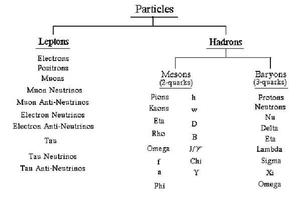 As stated in the previous section, the elementary particles of matter comprises of quarks and leptons. Hadrons are made up of quarks and are identified in the same classification level as leptons. Unlike leptons, which do not experience the strong nuclear force, hadrons experience all four fundamental forces. Hadrons are generally larger than leptons. Hadrons are sub-divided into baryons and mesons. Baryons and mesons are made up of different types of quarks and antiquarks.
