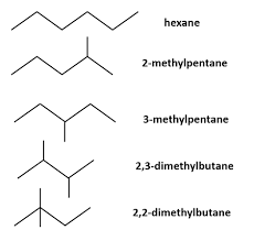 Structural or constitutional isomers have completely different structures and names. Any isomer that exists but shares the same quantity of atoms (having the same molecular formula) but differing structures are structural isomers. For example: hexane, 2-methylpentane, 3-methylpentane, 2-3,dimethylbutane, and 2,2-dimethylbutane are all structural isomers of each other. They all share the same molecular formula of: