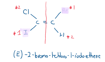 If the highest priority atoms are on the same side, the molecule gets a (Z) denotation. If the highest priority atoms are on the opposite sides, the molecule gets an (E) denotation.