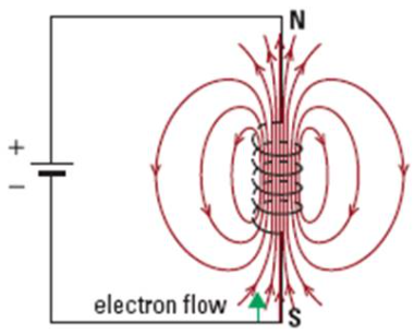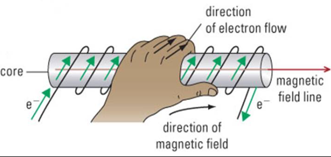 If the current is in a coil of conducting wire, the curled fingers of the left hand indicate the circular electron flow and the straight thumb indicates the direction of the straight magnetic field within the coil. The end of the solenoid that the thumb points to behaves like the north pole of a magnet. The other end behaves like a south pole. To strengthen the field and create an electromagnet an iron core could be placed in the centre of the solenoid as the domains of the iron align with the field strengthening the field. Note: If conventional current is used the same rules apply but using the right hand instead of left hand.