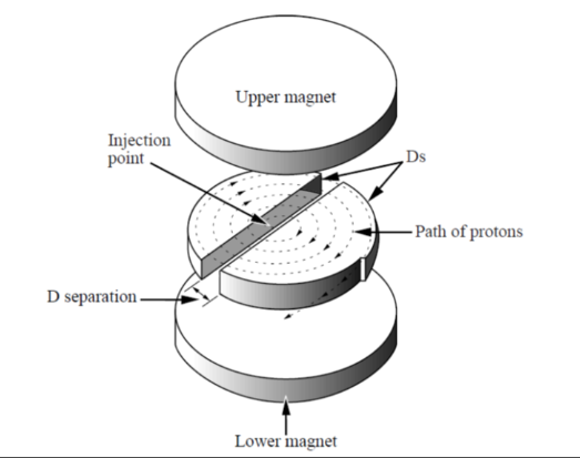 A cyclotron is a particle accelerator that is constructed of two hollow metal shells shaped like Ds in a perpendicular magnetic field created by magnets, as shown below. The entire apparatus is placed in a vacuum. An alternating voltage is maintained across the D separation. Positively charged particles such as protons are injected near the centre of the Ds and travel in circular paths caused by the external perpendicular magnetic field. The frequency of the alternating voltage is adjusted to increase the speed of the particles each time they move across the Dsâ separation.