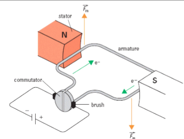 The current and the magnetic field (produced by the magnets (stators)) acting on the commutator produce a downwards and upwards force causing the motor to spin to 90 degrees. However to continue the spinning of the motor, the current is cut off, and the commutator is able to move past 90 degrees. After this point, there the current is applied again, and the force is again acting on the âedgesâ of the commutator; causing it to spin.