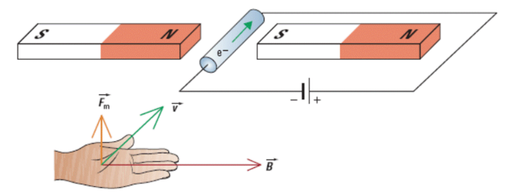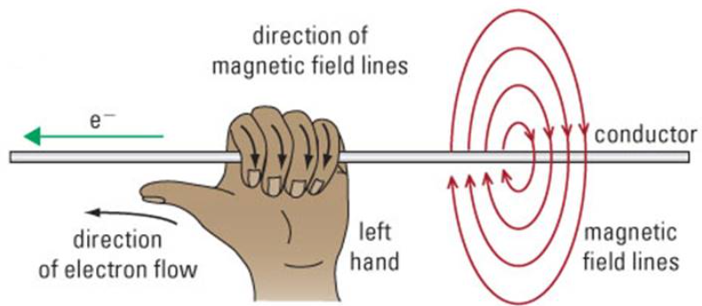 Left handâs thumb is the direction of negative charge flow (if flow of a proton, use right hand), v. The direction the magnetic field follows the tips of the left hand, B. Finally, the direction of magnetic force comes out of the left handâs palm. **Often calculating an unknown using the following formula isnât too difficult. In order to be awarded full marks, direction is critical ad a third dimension is introduced. In order to find said directions, the third hand rule MUST be used. (When given magnetic field strength, current, and or force)