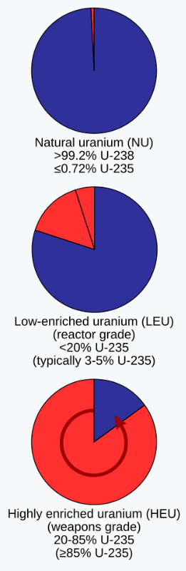 A sample of Uranium typically contains 99.2% Uranium-238 and 0.72% Uranium-235. Enriched Uranium contains at least 2-5% Uranium-235, although higher percentages are possible. Nuclear weapons require a sample that contains 99% Uranium-235.