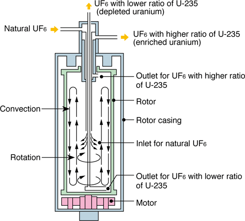 Uranium is enriched through the formation of hexafluoride followed by the separation of Uranium-238 and Uranium-235 in a gas centrifuge. In more detailed terms, a type of Uranium gas is put into a centrifuge — a series of cylinders with a rotor inside of them.