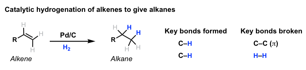 Hydrogenation is the process of adding to an alkene: e.g. The general reaction for this is: .