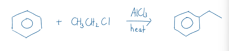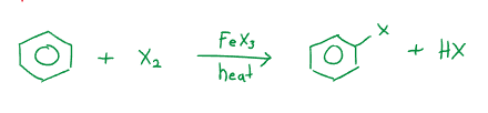 Halogenation reactions involve iron(III) halides, ; and aluminum halides, with heat as catalysts. For example: