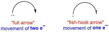 A ‘full’ movement is equivalent to 2 electrons moving, and is signified with an arrow with ‘hooks’ (curly arrow) on both ends. A ‘half’ movement is equivalent to 1 electron moving, and is signified with a ‘hooked’ (fish-hook) arrow