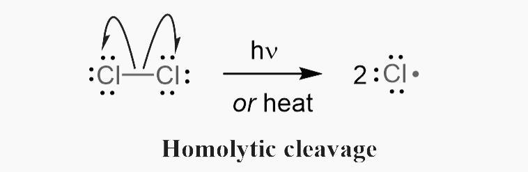Heat or UV light causes the weaker bonds in the halogen to undergo homolytic fission. Two radicals are produced.