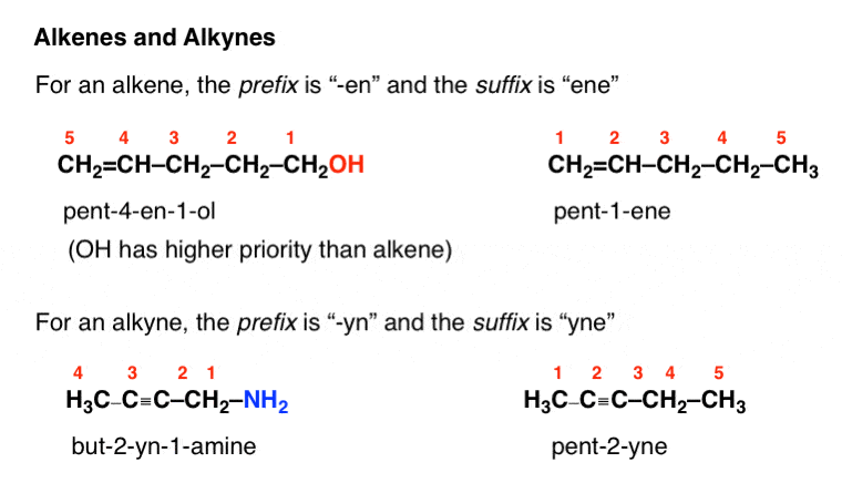 Alcohol group takes priority, therefore must be in the parent chain. The endings change by dropping the -e and replacing it with -ol (indicating the location before the ‘-ol’).