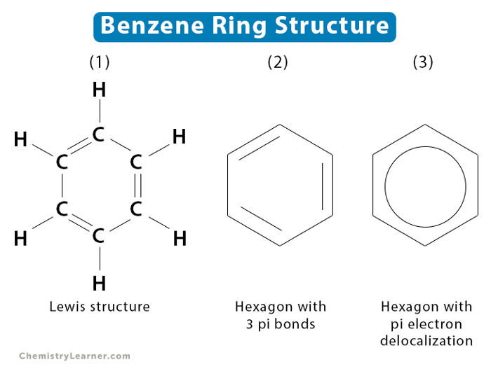 The classical way to represent a benzene molecule would be to denote single bonds with a singular line, and double bonds with two lines. However because a delocalized bond, the unhybridized p-orbitals in the otherwise structure from a resonance structure. This phenomena is denoted by replacing what would be a double bond with an arc between the single and double bonds. Thereby resulting in an a circular ring.
