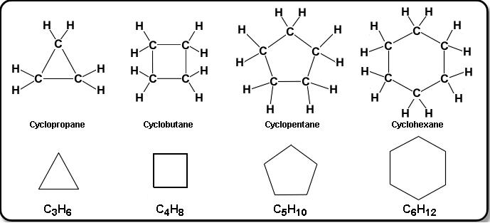 Cyclic structures are ring structures that have a closed loop of carbon atoms. The prefix ‘cyclo’ is used to to the aliphatic parent name. In Cycloalkanes, cyclo- is the prefix.