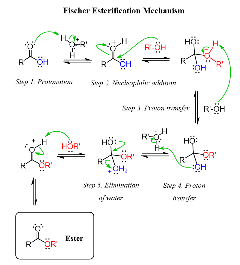 The of the carboxylic acid and the of the alcohol to form water. Bonding the single bonded to the carbon that was previously bonded to the hydroxyl group of the alcohol.