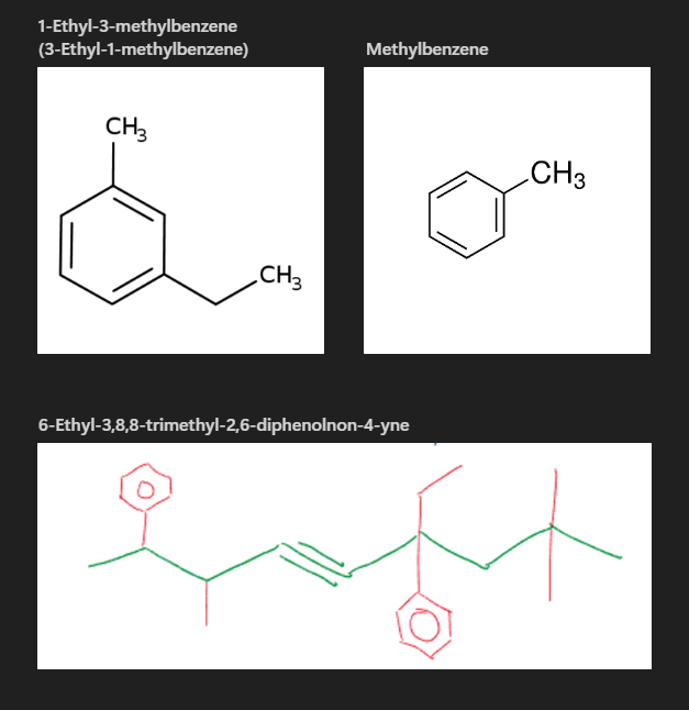 Benzene will be the parent name. Where in the name of branches follows the same rules as the cyclics. If a benzene is found in a branch, then it is replaced with the name ‘ phyenl-’ (benzene is not at the terminal end)