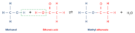 Methanol + ethanoic acid → Methyl ethanoate + water.