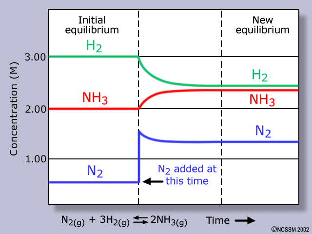 This can be seen when the concentration of is increased (reactant) and the reaction shifts left. Immediately after is added, the concentration decreases along with whereas the concentration of increases.
