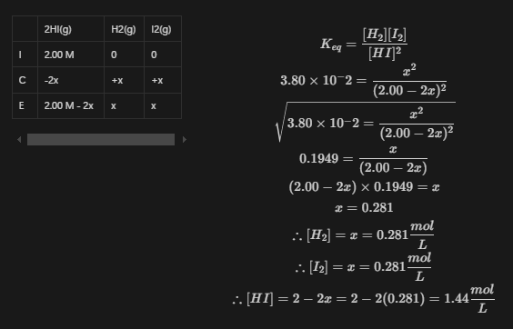 The formation of at has Calculate the equilibrium concentration of ammonia if the and at equilibrium \begin{gather} N_2 + 3H_2 \rightleftharpoons 2NH_3 \\ \Delta G ^ {\Theta} = -RTln(K_c)\\ ln(K_c) = \frac {\Delta G^{\Theta}}{-RT} \\ ln(K_c) = \frac {(-33.32) \frac {kJ}{mol} \times \frac {1000J}{1kJ}}{-(8.314 \frac {J}{mol \times K})(300K)} \\ln(K_c) = 13.3654... \\ K_c = e^{13.36554 } = 637562... \\ K_c = \frac {[NH_3]^2}{[N_2][H_2]^3}\\ 637572... = \frac {[NH_3]^2}{(0.2)(0.1)^3} \\ \therefore [NH_3] = 11.3 \frac {mol} L \end{gather}