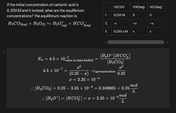 If the initial concentration of carbonic acid is and it ionized, what are the equilibrium concentrations? The equilibrium reaction is: