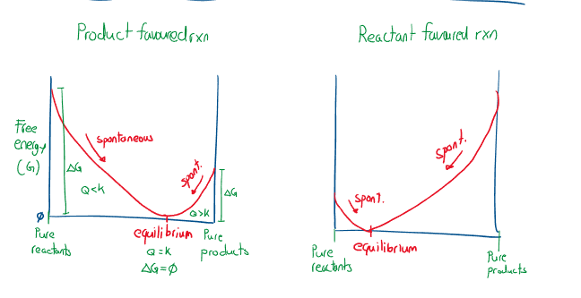 Recall that means that a reaction is spontaneous. (There is free energy available to break bonds, and partake in reaction). When Gibbs free energy = 0, the reaction is at equilibrium. Consider a reaction that only has reactants: The reaction will be driven forward (spontaneous reaction). Eventually which is another way of communicating that the spontaneity of the forward reaction is the same as the spontaneity of the reverse reaction. Additionally equilibrium occurs when there is maximum entropy possible in a system and minimum free energy. This can also be expressed graphically: