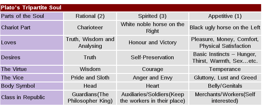 The appetite (physical desires) and will (emotional desires) are both the driving parts of the soul. Wherein the metaphorical horses of the soul drive the mind. It is rationality that allows human beings to be the rational driver of this metaphorical carriage. Personhood