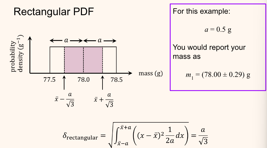 For this reason, a rectangular probability density is used to describe uncertainty (As opposed to Gaussian). Similar to a digital reading of â0.78â, it is unknown how likely the value displayed is the actual value. For this reason, when using an instrument, read the displayed/specified/implied (e.g. if a scale has a precision of 0.01, the uncertainty is 0.005âŠ) uncertainty on the instrument.