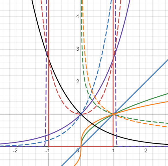 (Solid red then blue then green then orange then (1) purple then black then dashed version) - Observe the behavior at 1