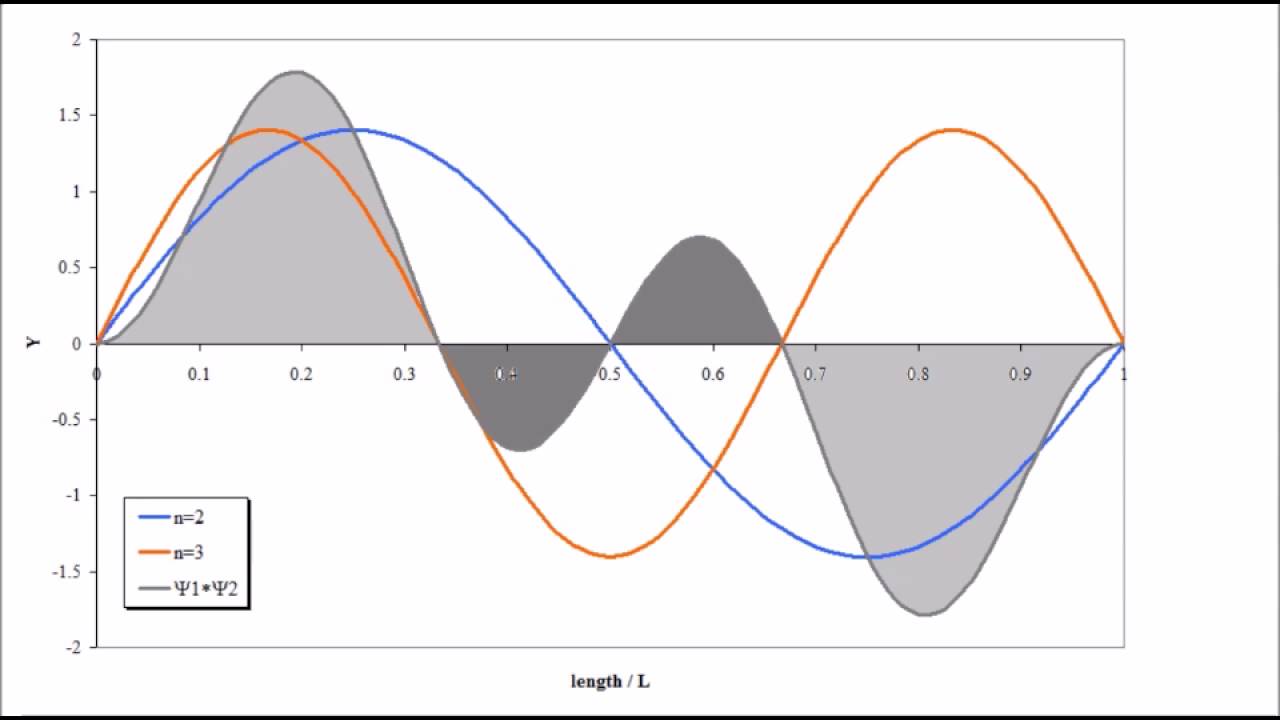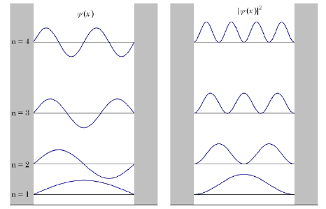 In order for to be true, must be a mathematical function whose second derivative gives the same function, back, multiplied by a constant. There are 3 equations that satisfy this definition, two of which are sinusoidal. While and both satisfy the Schrödinger equation, only is 0 at x= 0. Where and are constants, we also know that there is an infinite wall at , which means that the wavefunction of the particle must be 0 at , thus: The values of satisfy are: Where is the principle quantum number. (Note that if , then and thus everywhere, then the total probability of finding the particle is 0, and is ultimately not a physically acceptable solution to the Schrödinger equation). To make the wave function have fixed ends at the same height, describes different states of the quantum system and is a natural number. In order for the probability to be 1 in a 1-D box, the amplitude of the wave function must be: As the distribution is normalized to . When substituting all constraints: