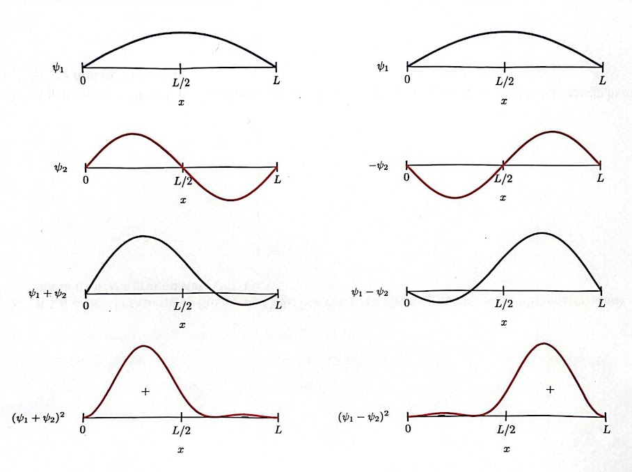 Similar to waves, wave functions undergo constructive and destructive interference. Wavefunctions can be combined by taking the sum of the wave functions at different states where each has a different coefficient: