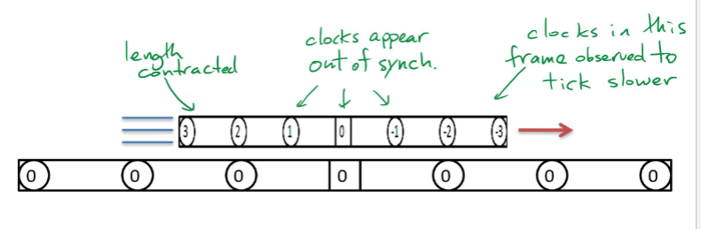 For observers on the track, the light will reach the back of the train faster than it will for the front. If synchronized clocks were set up inside the train, the people inside would observe the light reaching the ends at the same time (say noon); but in the frame of the In the frame of the track the back clock will read noon while the front clock will read an earlier time (waiting for the light to come)