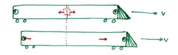 Another example: Suppose a train moves at a constant velocity along a track. People set a light to flash in the middle of the train so that the light reaches the front of the train and the back of the train at the same time (within the reference frame of the train).