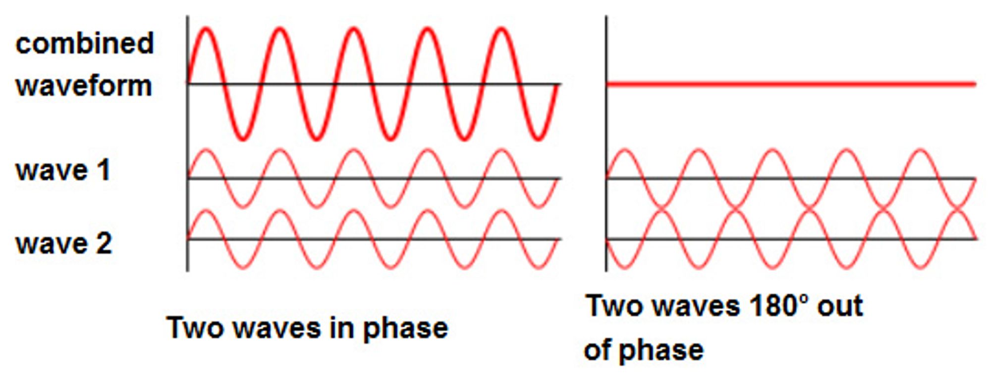 The left shows constructive interference (superposition) where the two waves add up (e.g. 1+1=2). The right shows deconstructive interference (superposition) where the two waves cancel each other (e.g. 1+(-1)=0).