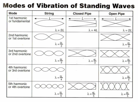 Air particles can oscillate and create standing waves in pipes with open or closed ends. Antinodes are positioned at open ends and nodes are positioned at closed ends. Standing waves on a string is equivalent to that in a pipe which is closed on both ends (nodes-node). The following table summarizes the behavior of standing waves in pipes and strings: