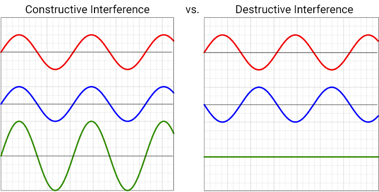 Constructive interference occurs when two crests or two troughs are at the same point: amplifying the two (or when two points of a wave of equal magnitude and amplitude superimpose on each other). e.g. wave A has a point of the wave with a height of 1, and wave B has a height of 1 at the same point. The resulting interference is constructive as the resulting amplitude is 2. Destructive interference occurs when a crest and a trough ‘cancel’ each other by having the same magnitude with ‘opposite’ amplitude: e.g. wave A has a point of the wave with a height of 1, and wave B has a height of -1 at the same point. When they interfere, they have a resulting height of 0 as they destructively interfere.